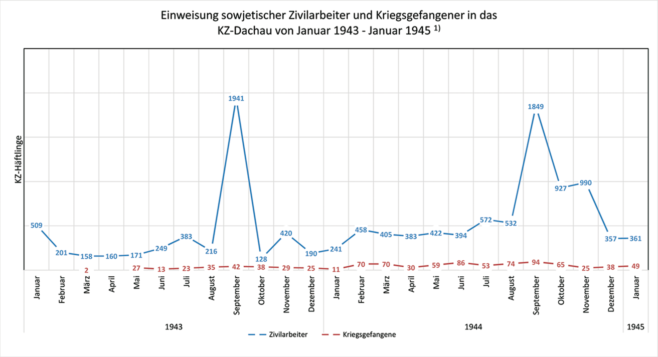 Die Auswertung der Häftlingsdatenbank in Dachau ergab, dass im Verlauf des II. Weltkriegs 25.343 sowjetische Bürger - Kriegsgefangene und Ostarbeiter - in das KZ-Dachau überstellt wurden. 1) Davon waren 2.155 sowj. Staatsbürger zwischen Januar 1943 und Januar 1945 als KZ-Häftlinge in das KZ-Außenlager Dachau-Allach überstellt worden. Die Durchsicht der Allacher Veränderungsmeldungen, also der Zu- und Abgangsmeldungen ergibt folgendes Bild: Für den Zeitraum von Februar 1943 bis Januar 1945 sind für das KZ-Außenlager Dachau-Allach mindestens 120 sowjetische Kriegsgefangene namentlich nachweisbar. Die zusätzlich für BMW arbeitenden 608 sowjetischen Kriegsgefangenen hausten im BMW-eigenen Kriegsgefangenenlager an der DachauerStraße gegenüber dem BMW-Flugmotorenwerk. Die KZ-Einweisungen sowjetischer Zivilarbeiter ab Herbst 1942 erfolgten durch Absprachen zwischen den Stapo-Stellen und den Arbeitsämtern außerhalb des Schutzhaftverfahrens und waren obligatorisch. Der Arbeitskräftemangel in der Rüstungsindustrie war so groß, dass Heinrich Himmler Mitte Dezember 1942 befahl, bis zum 1. Februar 1943 mindestens 35.000 Personen in die KZ einzuweisen: "Ab sofort werden fremdvölkische Arbeiter, welche flüchtiggegangen und vertragsbrüchig geworden sind (. . .) auf dem schnellsten Wege in die Konzentrationslager eingeliefert ." 2) In Zusammenarbeit mit den deutschen Besatzungstruppen, der Wehrmacht und der Sipo erfolgte der Transport in das "Reich" mit der Deutschen Reichsbahn.