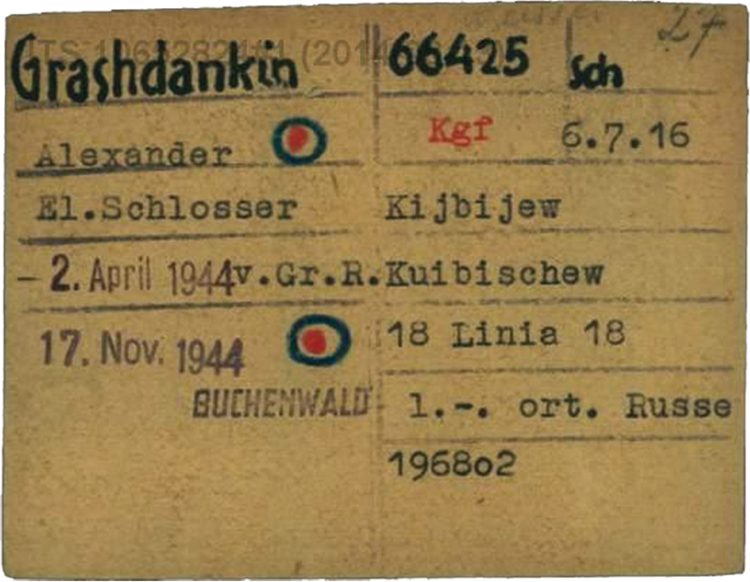 Blaichach verlegt werden durften. Ein Grund war die hohe Fluchtquote der sowjetischen Kriegsgefangenen in diesen Aussenlagern und bei den Arbeitseinsätzen. Alle sowjetischen Kriegsgefangene wurden zunächst als Schutzhaftgefangene mit den Kürzeln Sch und Kgf auf ihrer Karteikarte geführt und pro Fluchtversuch mit einem Fluchtpunkt (blauer Kreis mit rotem Punkt) markiert. Alexander Grashdankin wurde am 02.04.1944 vom KZ-Groß-Rosen über Dachau in das KZ-Außenlager Dachau-Allach überstellt. Er hatte bis dahin zweimal zu flüchten versucht.