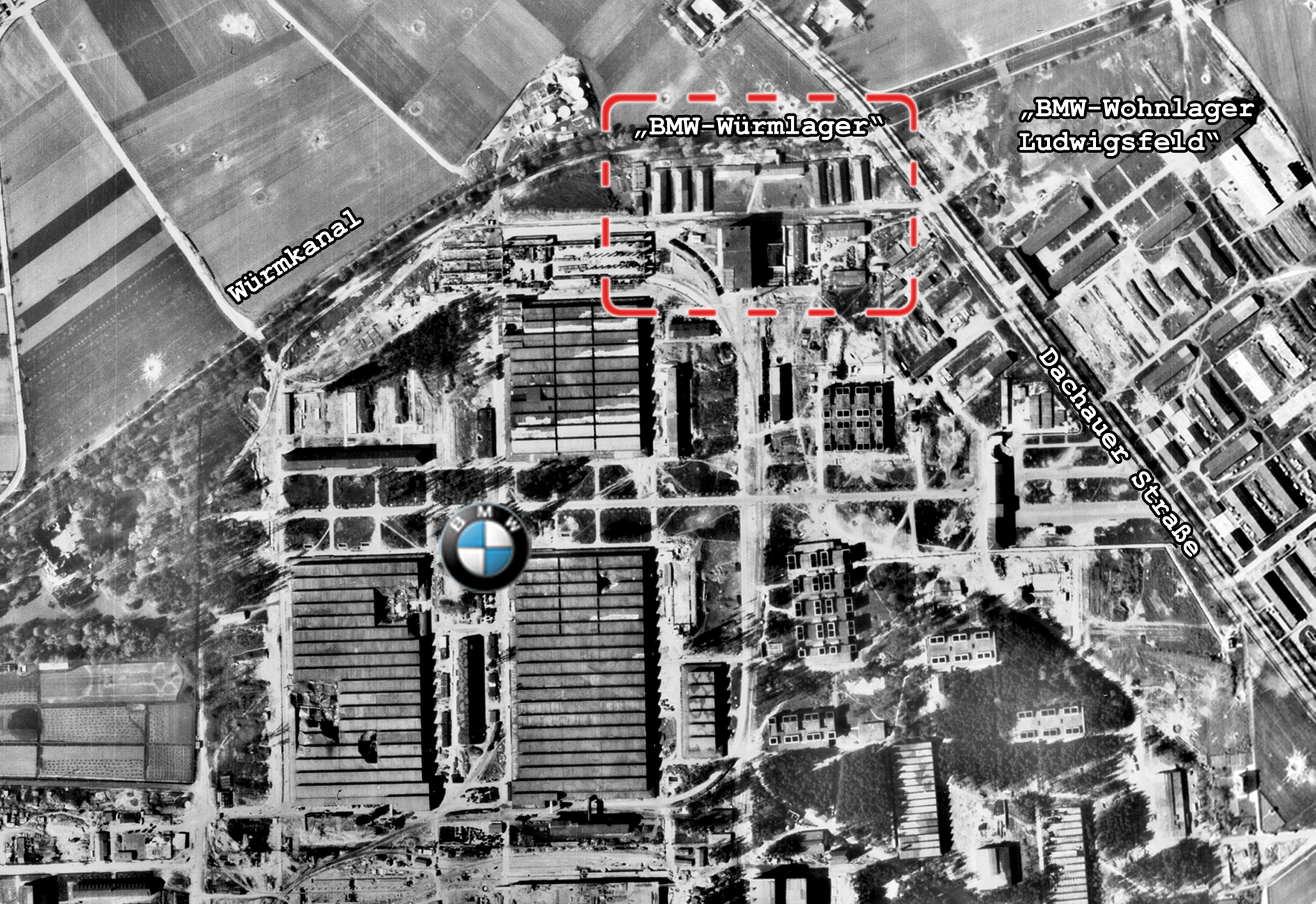 Das „Würmlager“ auf dem BMW-Firmengelände des Allacher Flugmotorenwerks am 7. Mai 1945. Davor die Dachauer Straße als Allee. Unten ein Luftschutzbunker der BMW-Wohnsiedlung Ludwigsfeld, die gegen Kriegsende mit etwa 1.000 Fremdarbeitern belegt war. Oben links das Heizkraftwerk des BMW-Flugmotorenwerkes, am rechten Bildrand der Würmkanal.